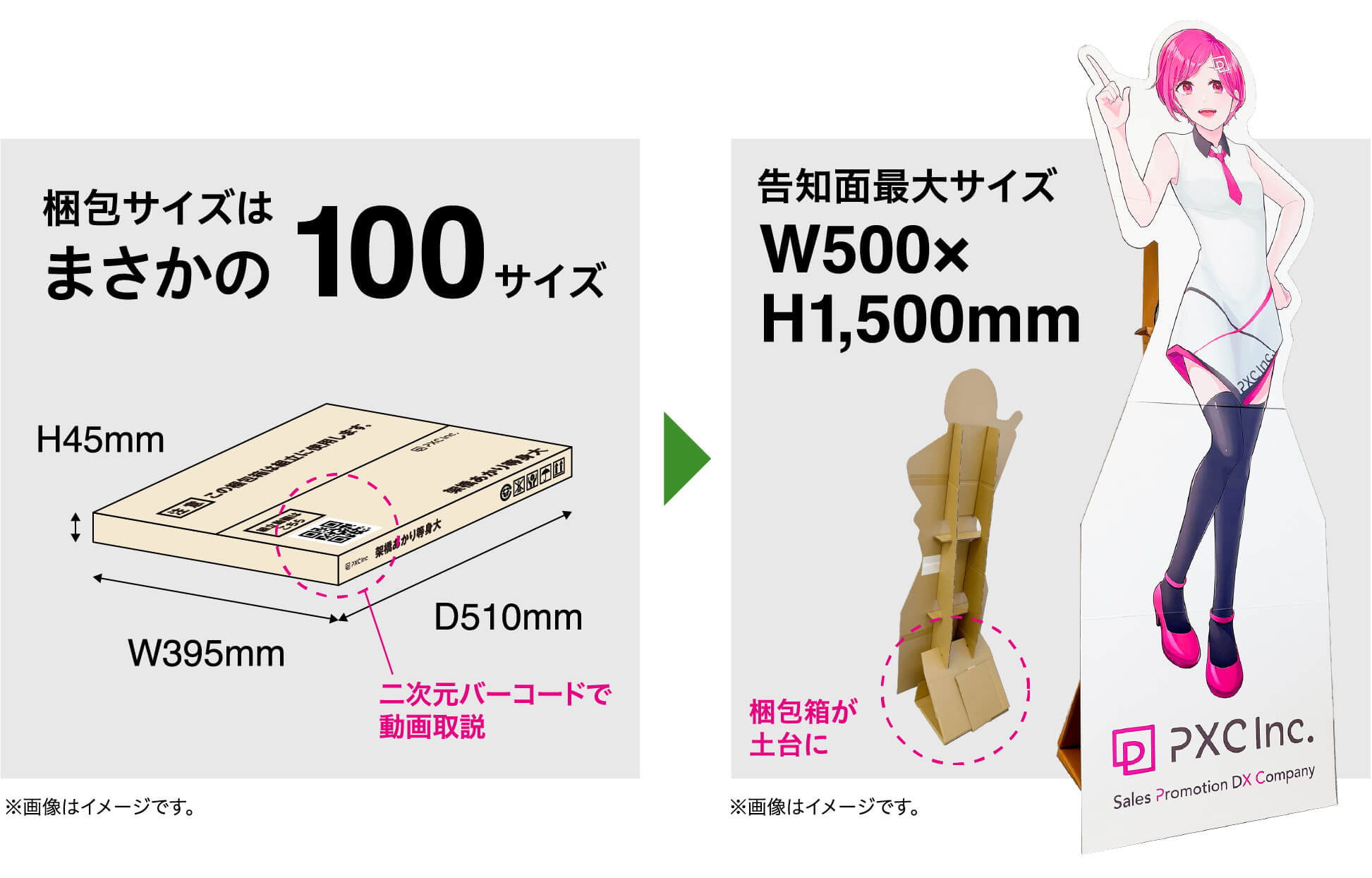 一般的に等身大ボードは大きな箱で届きますが、「等身大ボード eco100」は宅配便の100サイズの箱(縦・横・高さの合計が100cm以内)で届く商品です。