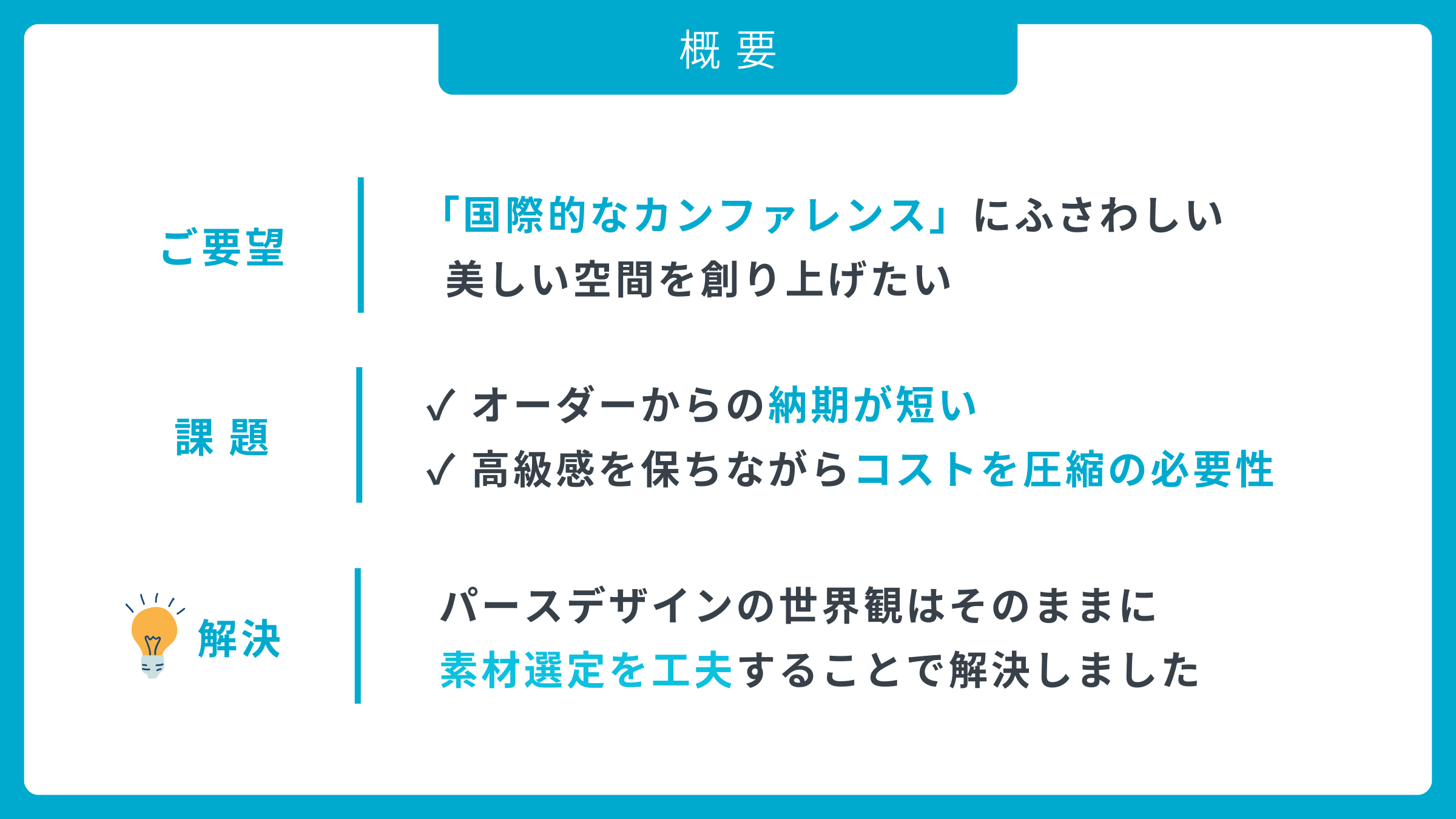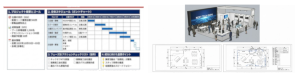 細部までこだわった美しい空間を創り上げ、競合他社のブースとの差別化を図ること。 - (潜在的な課題)コストと納期の最適化