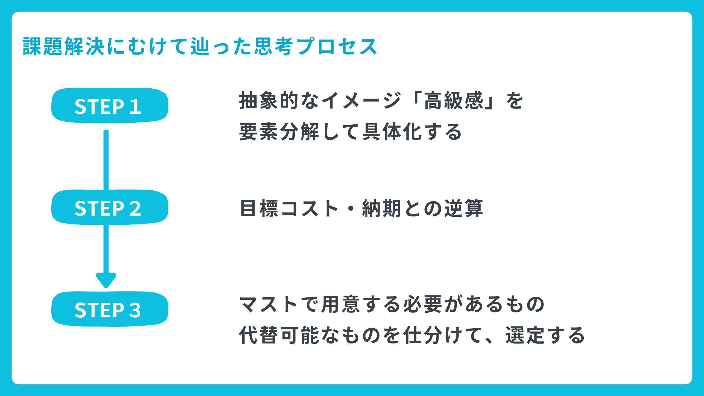 前述の課題解決のため、、従来の制作手法に囚われず、品質を落とさずにコストと工期を圧縮するため、以下のステップで実行内容を定めていきました。