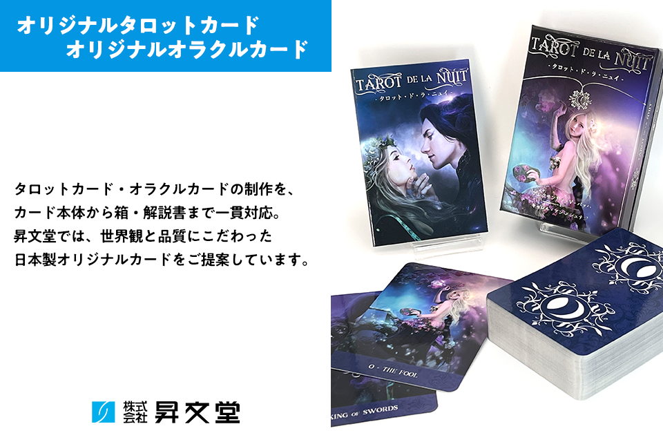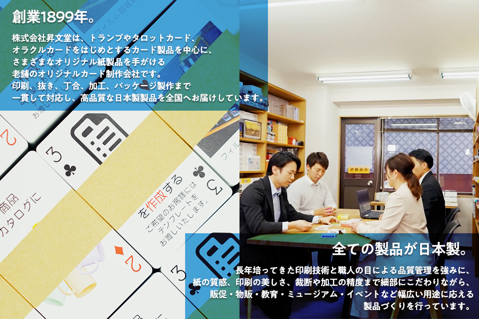 創業1899年。株式会社昇文堂は、トランプやタロットカード、オラクルカードをはじめとするカード製品を中心に、さまざまなオリジナル紙製品を手がける老舗のオリジナルカード制作会社です。印刷、抜き、丁合、加工、パッケージ製作まで一貫して対応し、高品質な日本製製品を全国へお届けしています。
