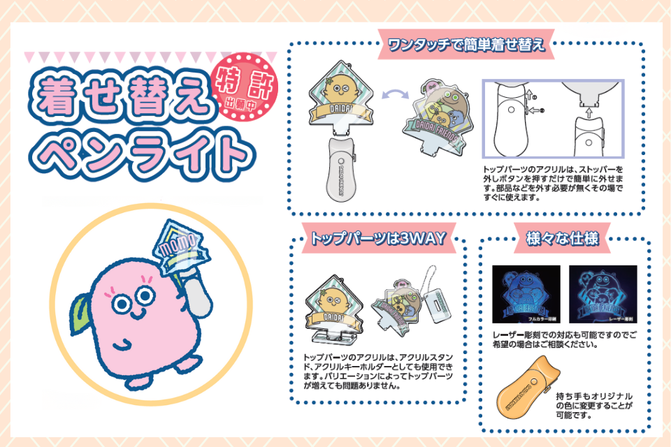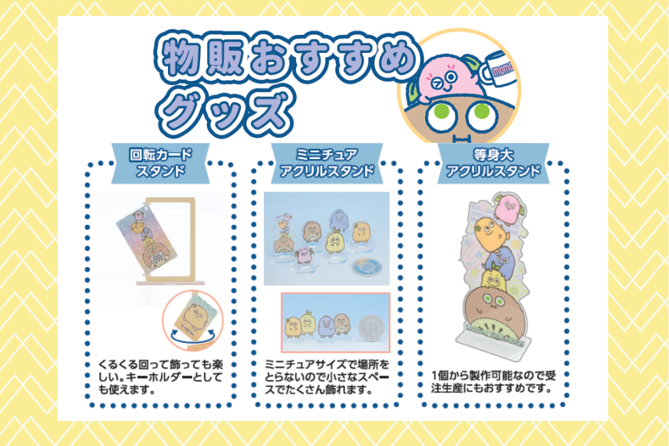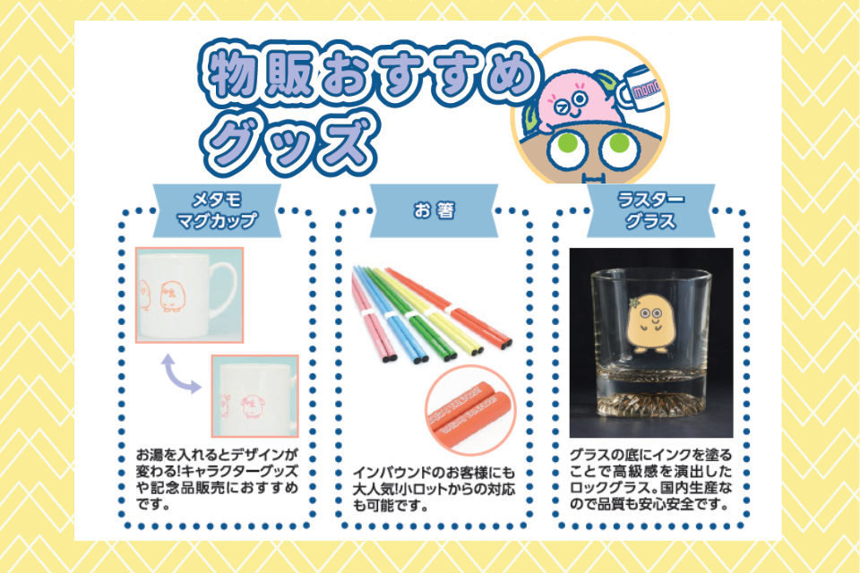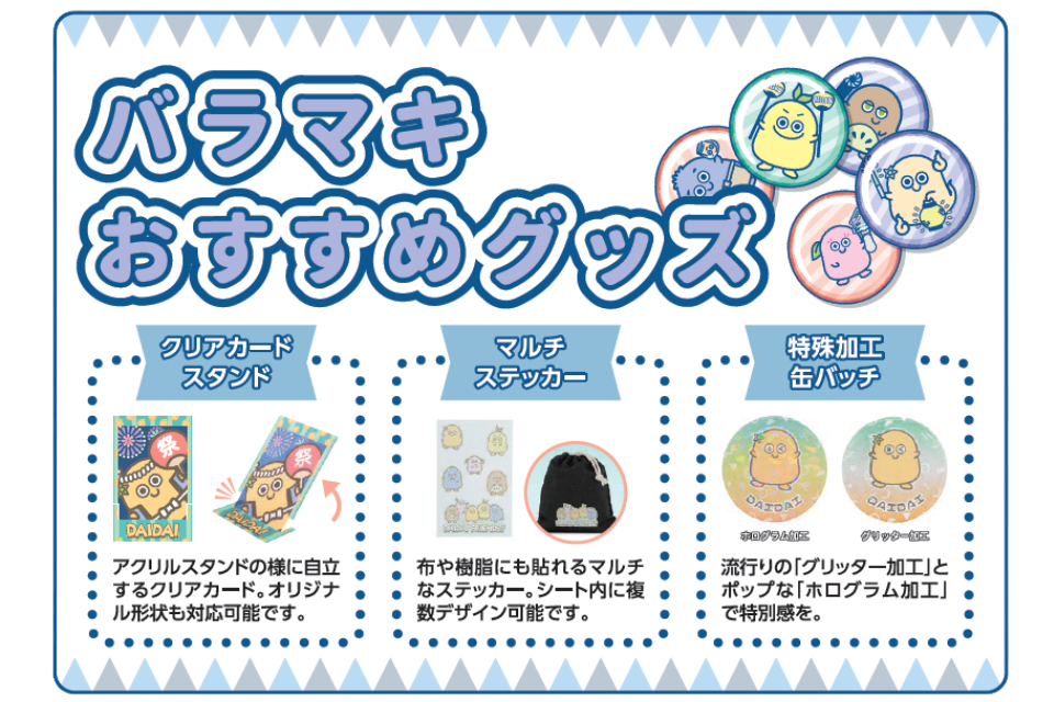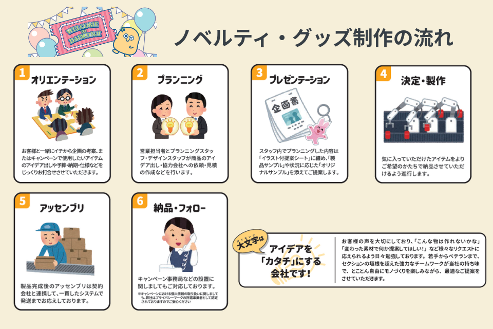 キャンペーン景品などで活躍する企業ノベルティ・物販グッズ・コンサートグッズの企画/制作企業です。お客様の販促戦略の実現に向け、企画提案からご支援します。専任者がお見積りから納品まで担当しますので、どなたでも安心してオーダーいただけます。
